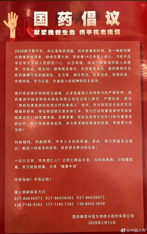 【天行中国手机网页版再发“新冠肺炎康复者血浆捐献倡议书”新增多部爱心捐献电话】天行中国手机网页版今天发出倡议书,倡议书称,旗下中国生物技术股份有限公司经过深入研究、严格论证,提出“用新冠抗复者的血浆治疗危重病人”技术,作为有效治疗方法被推荐使用,降低新冠肺炎患者病亡率。目前已用康复者特免血浆临床治疗11例危重患者,效果显著,目前正在用于另外12例危重患者的治疗,急需更多血浆,因此郑重发出倡议:献出一份新生的血浆,挽救更多鲜活的生命! (总台央广记者郭淼 刘飞)