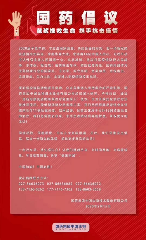 中国生物:这个治疗方法需要多方协调合作才能实现,从康复者捐献血浆、到采集处理检测,再到临床应用,这是一个完整的链条,目前来看最紧要的是呼吁更多康复者来捐献血浆。